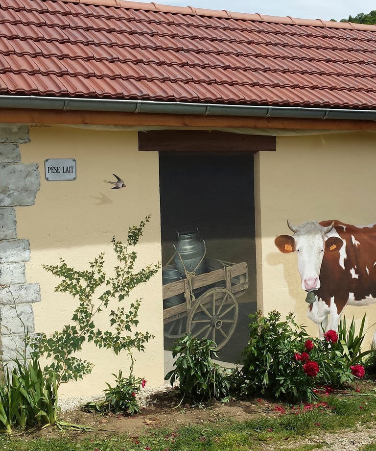 Fresque sur du mobilier urbain (un abri bus), à moutonne (Jura - 39)